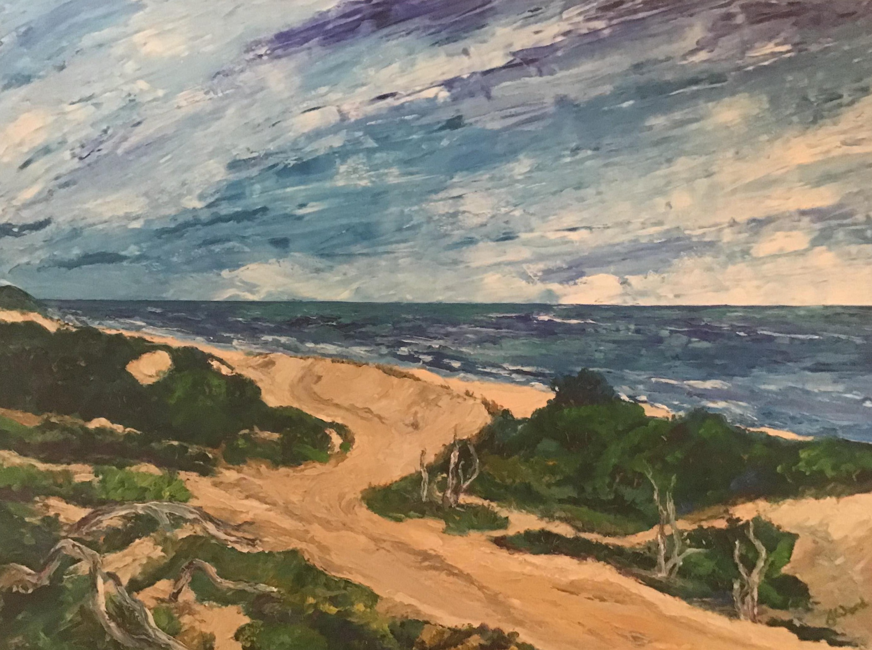 Julie was legally blind at 15 years of age, a daunting ‘ courage-building’ experience that was alleviated by donated corneas for her grafts. It’s no wonder her work is large and bright, a reflection of her life-changing experience.