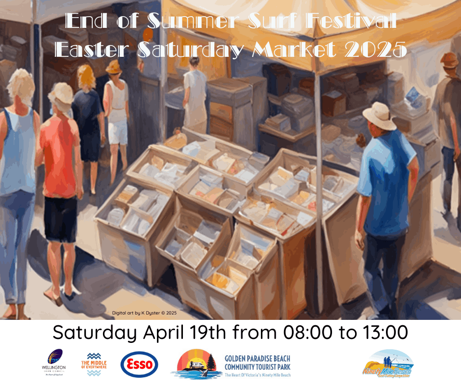 The next Market day will be during the 2025 End of Summer Surf Festival on Easter Saturday, April 19th and will be held in the Community Tourist Park between 8:00am to 1:00pm.